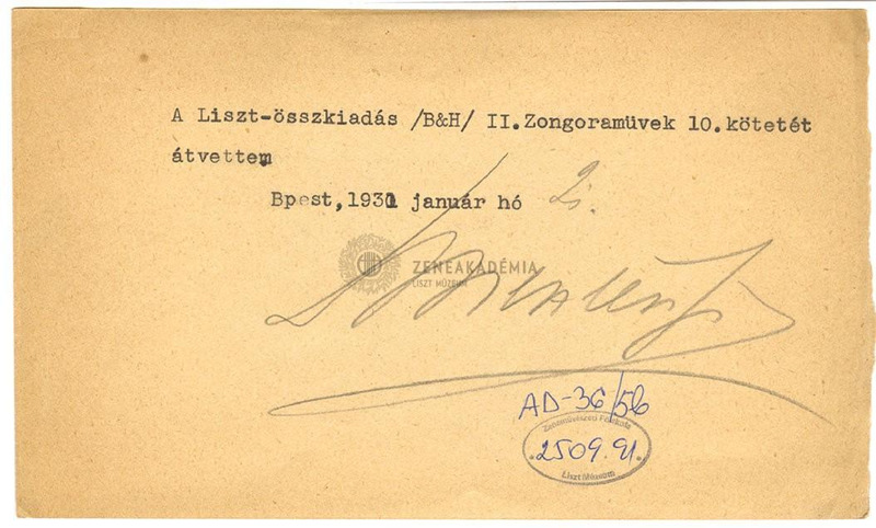 - Tibor Meszlényis acknowledgement of receipt of volume 10 of II. Piano Works of the Liszt complete edition.