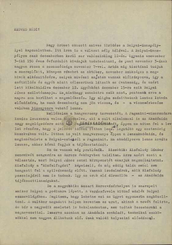 On Bolyai celebration. Bolyai and music. Attachment: Do not forget him, concert plans of Bolyai commemoration.