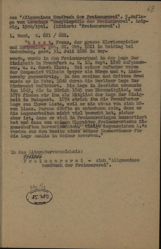 Citation about the relationship of Liszt and the Freemasons from the book "Aus Allgemeines Handbuch der Freimauerei"