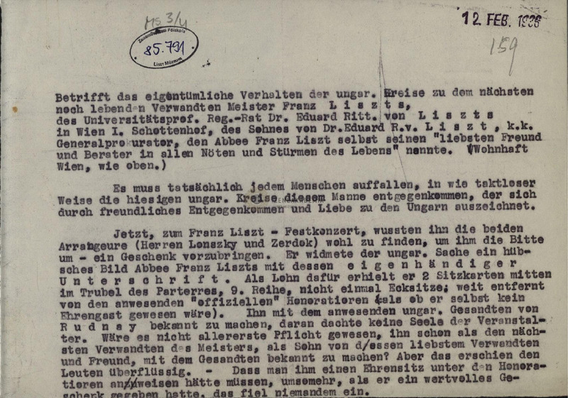- Eduard Liszts grievance by the Hungarian organisers of the Liszt-concert. Half page typed copy.