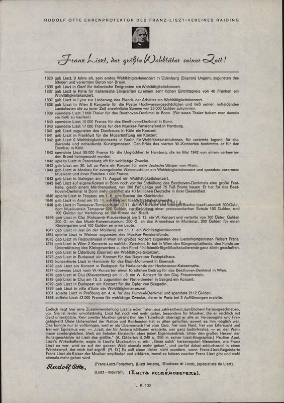Wording like, as an addition to an unknown, bigger work . Incomplete typed copy with handwritten corrections. Typed onto Rudolf Ottes "Franz Liszt, der grösste Wohltäter seiner Zeit" small print version.