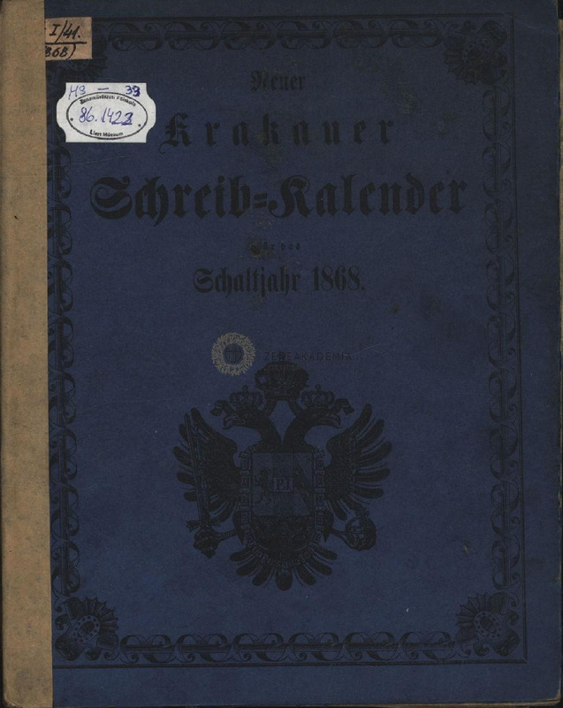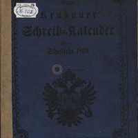 - "Neuer Krakauer Schreibkalender für das Schaltjahr 1868." In some places, handwritten pages written in ink are placed between the pages of the calendar.