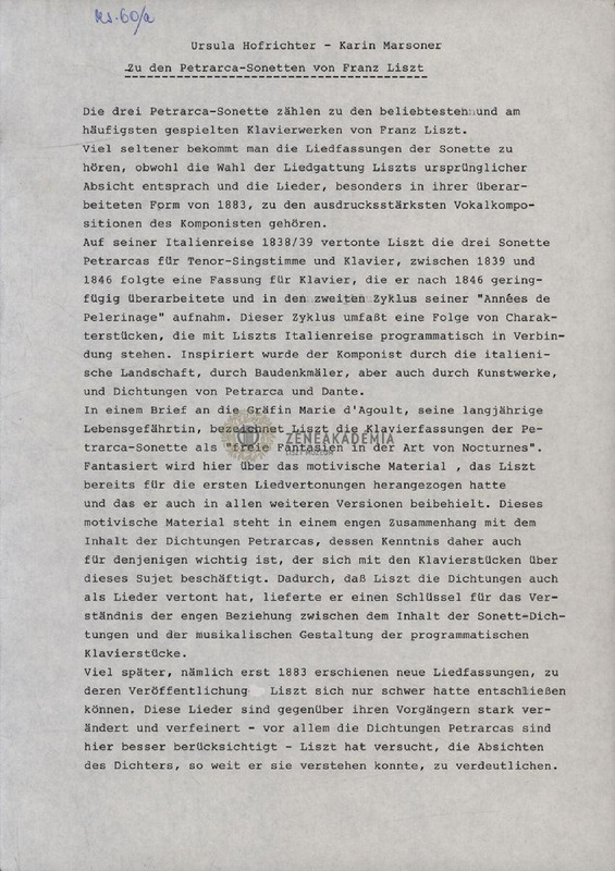 A performance at the Liszt Museum Concert on October 10, 1987.a) Full German text of the original performance + German translation of Petrarca sonnetsb) Slightly abbreviated Hungarian translation + two short biographiesc) Concert program: program of 1986 performances and concerts in Eisenstadt in a small booklet. With short biographies of artists and music historians.d) Hungarian translation of Petrarca sonnets (47, 104, 123)