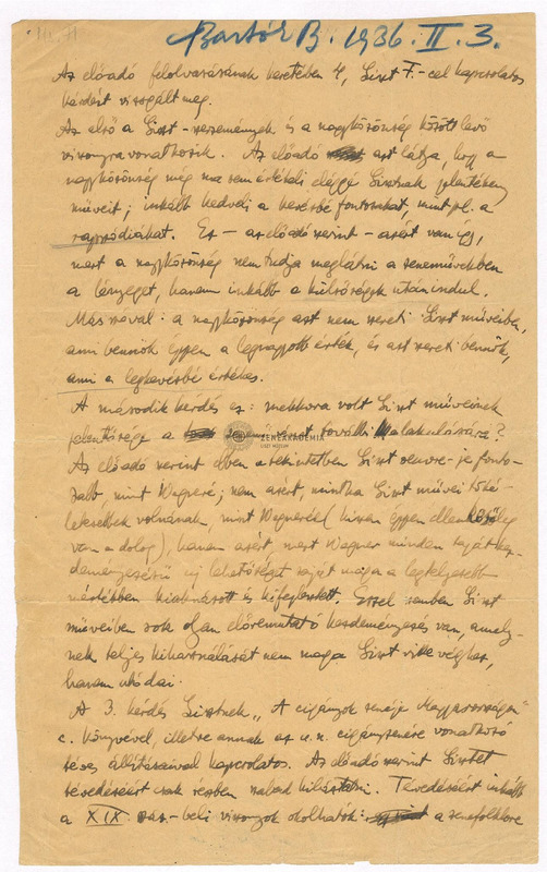 - Autograph summary of Bartóks lecture on February 3, 1936, Liszt chair-occupier. The signature is glued separately.