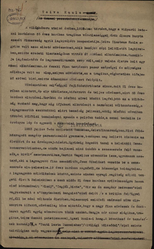 - A short typed article with corrections in ink about the Finnish composer (he died in 1919 at the age of 35 in a military hospital).