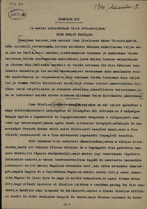 Unsigned article / lecture for the 75th anniversary of Sibelius birth. Greetings in Finnish at the beginning. With corrections in ink.