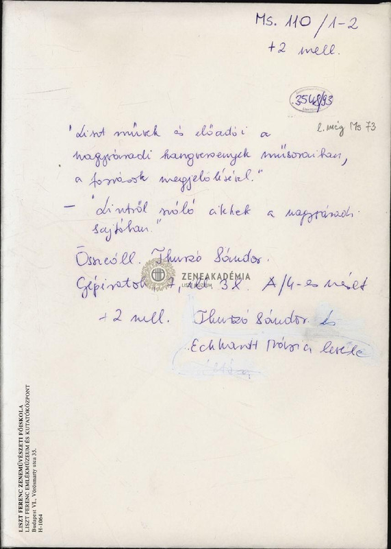 It was compiled and sent to Mária Eckhardt by music researcher Sándor Thurzó from Oradea. Letter and reply letter of Mária Eckhardt are attached.1) Concert list with sources2) Articles on Ferenc Liszt