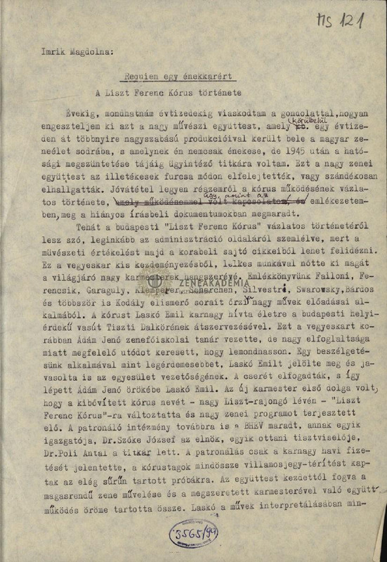 Magdolna Imrik (Mrs. György Szomjas-Schiffert): Requiem egy énekkarért." A Liszt Ferenc kórus története (Requiem for a choir. The history of the Liszt Ferenc Choir)