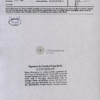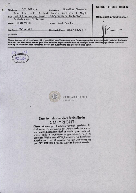 "Franz Liszt - Ein Portrait in drei Kapiteln. 1. Abgott und Schrecken der Umwelt: Schöpferische Imitation". In an envelope addressed to Mária Eckhardt.