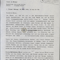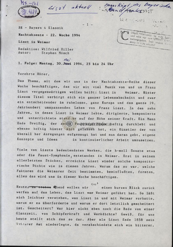A note beginning with "Liszt in Weimar ...". The co-workers of the radio show are Stephan Mösch and Wilfried Hiller. In an envelope for Mária Eckhardt.