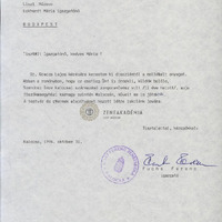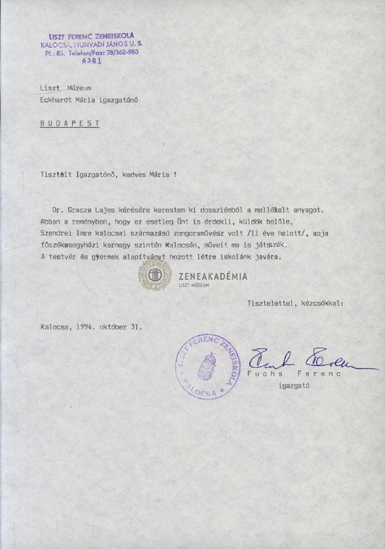 Information of the Archbishops Authority of Kalocsa - György Csái. With a cover letter to Mária Eckhardt from Ferenc Fuchs, director of the Ferenc Liszt Music School in Kalocsa, .