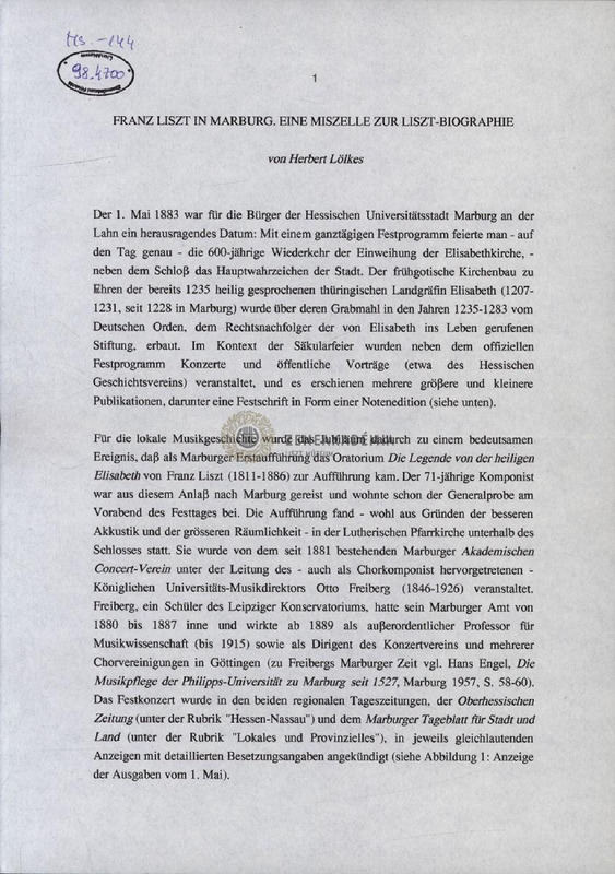 Herbert Lölkes: "Franz Liszt in Marburg, eine Miszelle zur Liszt-Biographie". In an envelope for Mária Eckhardt.
