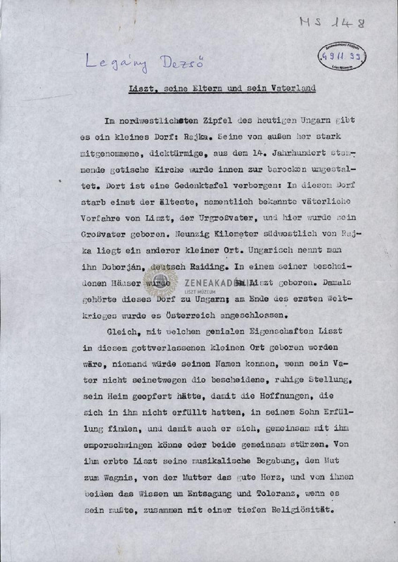 - "Liszt, Eltern and Wall Water". Typed pages in German.