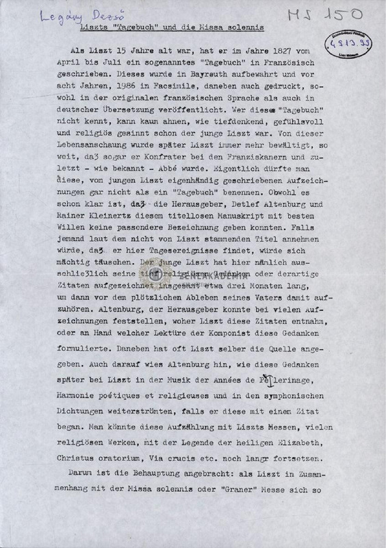 - "Liszts" Tagebuch "und die Missa solennis". 7 pages in German.