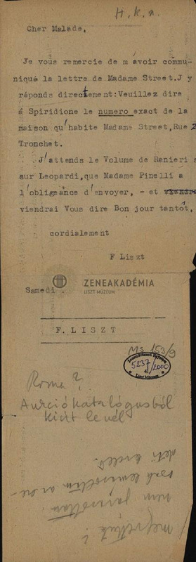- Typographical copy, "Cher Malade". Liszts letter raised at auction. Prahács M. did not offer to buy it, she just copied it.