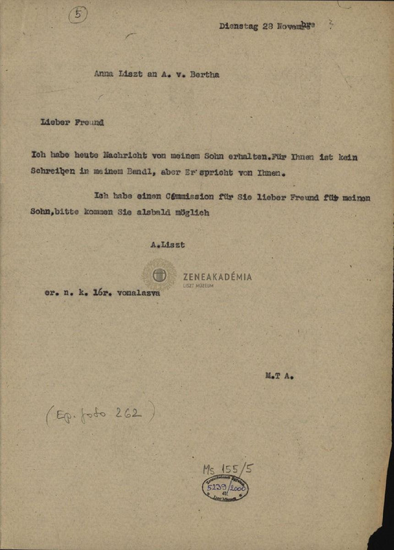 - Letter from Anna Liszt to Sándor Bertha.