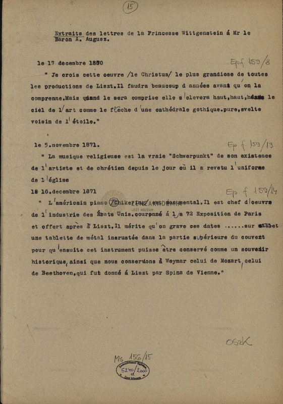Letter from Carolyne zu Sayn-Wittgenstein to Antal Augusz.