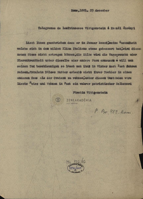 Carolyne zu Sayn-Wittgensteins telegram to Kornél Ábrányi.