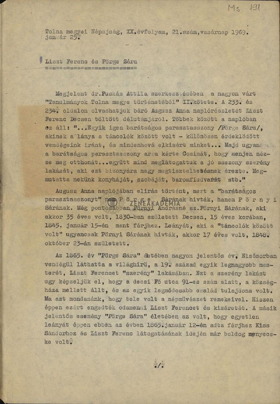 Typed text of an article published in the 1969 issue of the Tolna County Peoples Newspaper. Liszts visit to Decsen in 1865.