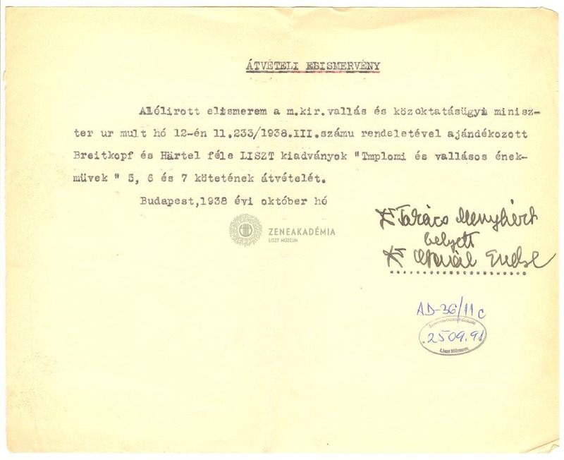 - Receipt of the 3 volumes of “Sacred Choral Music” of the Liszt complete edition signed by dr.Endre Gaál on behalf of Menyhért Takács.