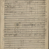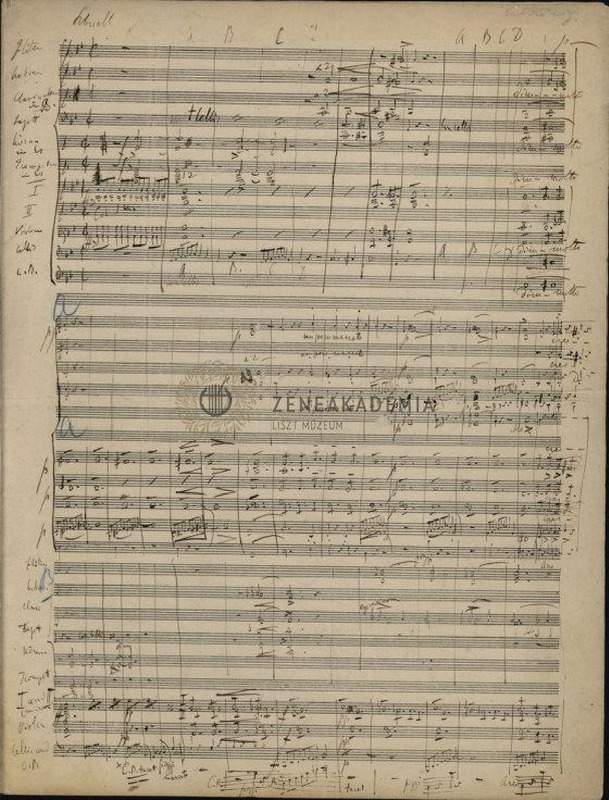 - Working manuscritp written with black ink, additions in blue pencil. Bifolio, 32 staves/page. Four written pages.