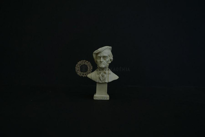 - A full-profile bust of Richard Wagner on a pedestal, a Swiss cap on his head, wrinkles on his forehead and under the eyes. The upper part of the suit can also be seen with a bow tie. Inscription on pedestal: R. Wagner