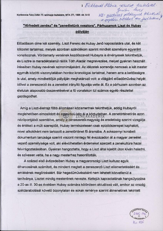 Text of the lecture ""Paralells between Liszts and Hubays Career""