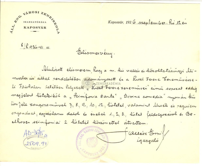 - Acknowledgement of receipt of Emil Soltész, director of the music school of Kaposvár, of 10 volumes of the Liszt complete edition.