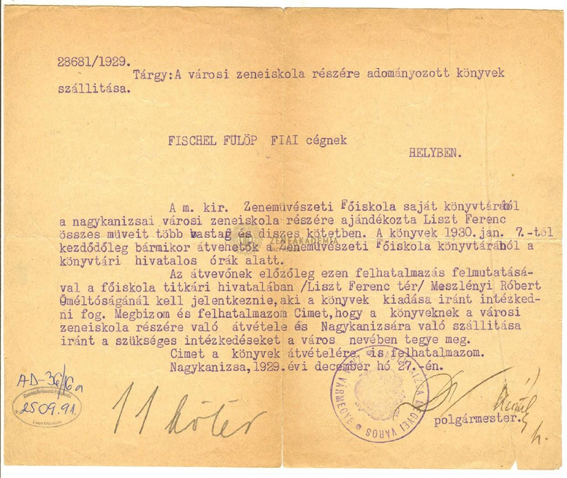 - Authorization of the mayor of Nagykanizsa for the firm "Fischel Fülöp & Sons" to take over 11 volumes of the Liszt complete edition for the music school of Nagykanizsa.