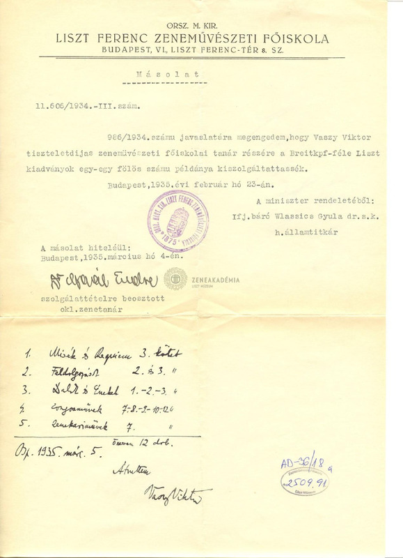 Copy of the permission of the deputy under-secretary of state, Baron Gyula Wlassics jun. to give a surplus copy each of the Liszt edition to Viktor Vaszy, professor of the Hungarian Academy of Music. Copy authenticated by Dr. Endre Gaál, music teacher on duty. He received them in Budapest, 5 March 1935.