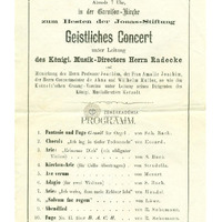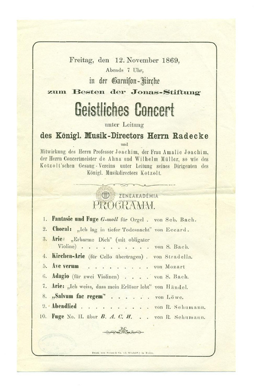 Programme: pieces by Bach, Ecard, Stradella, Mozart, Händel, Löwe and Schumann. (With contribution of Joachim (Mr and Mrs), de Ahna, Wilhelm Müller, the Kotzolt schein ensemble under direction of Kotzolt, cond. Radecke - Royal Music Director).