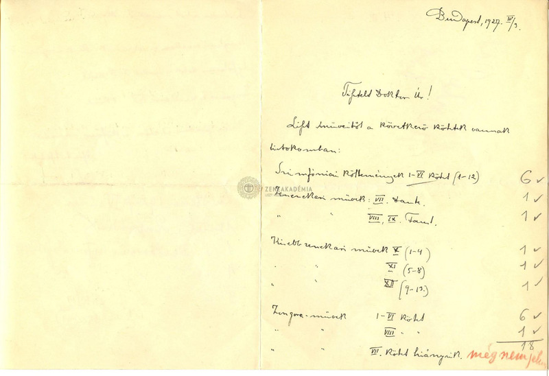 - Letter by Pál Szente enumerating the volumes of the Liszt complete edition in his property and the missing ones.