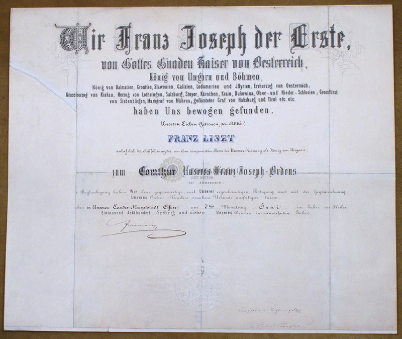 A Ferenc József Rend lovagkeresztjét Lisztnek adományozó okirat, a koronázási szertartásra írott Koronázási Mise elismeréseképpen, "viribus unitis" nyomott pecséttel.