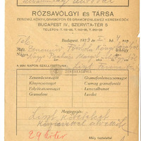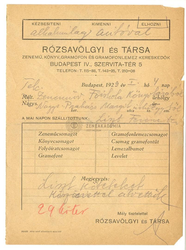 A Rózsavölgyi és Társa elismervénye a Liszt-összkiadás 29 kötetének átvételéről a Zeneművészeti Főiskola könyvtárából s azokat autóval elszállították.