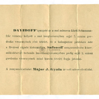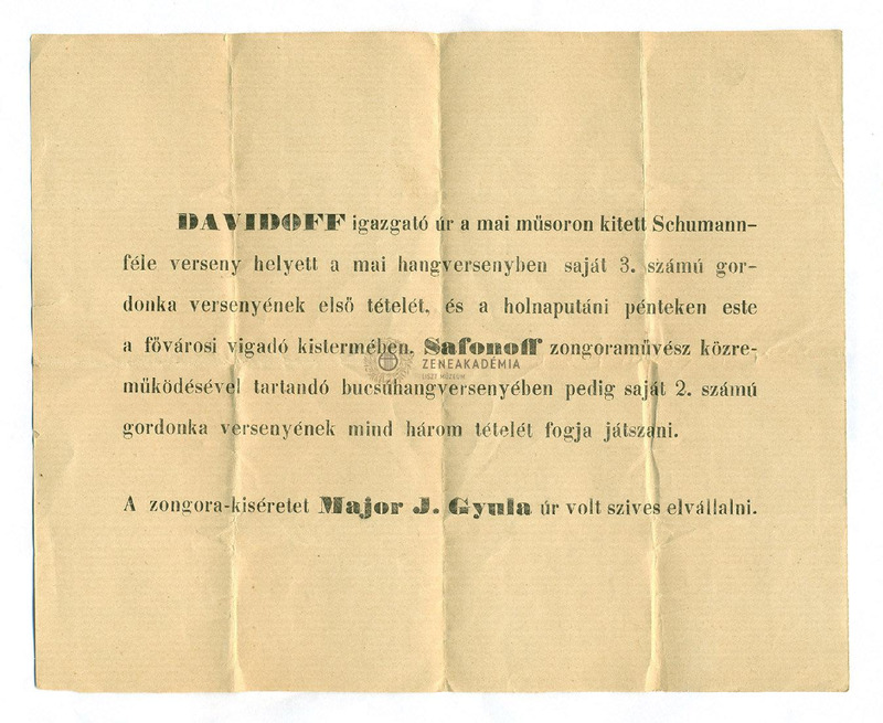 Értesítő, melyben Davidoff tudatja, hogy Schumann versenyműve helyett saját gordonkaversenyét adja elő. Első alkalommal csak az első tételt, majd pénteken, a Vigadó kistermében az egész művet. Közreműködik Safonoff (zongora), a zongora-kiséretet Major J. Gyula látta el.