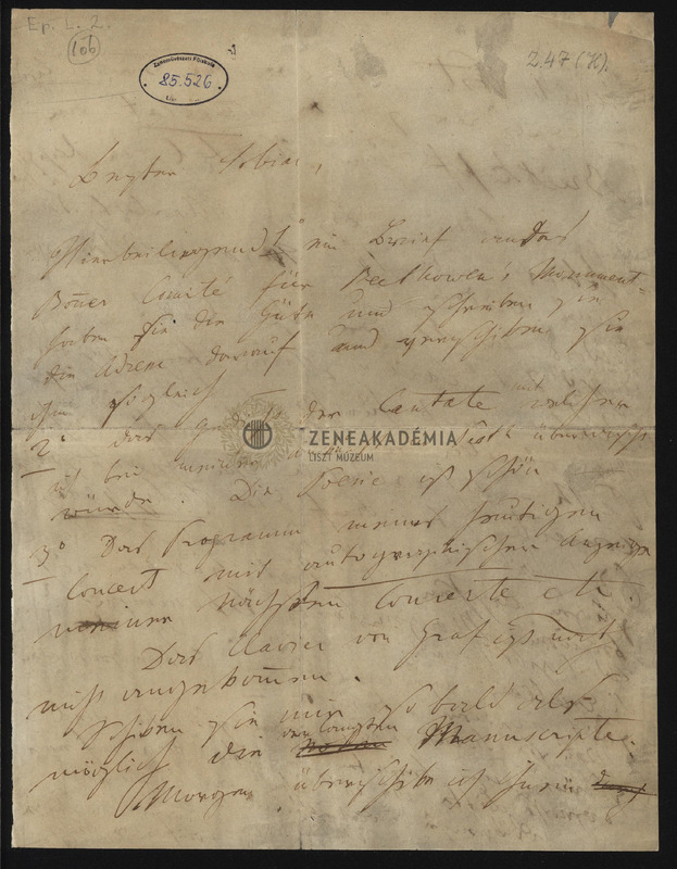 Liszt Haslingert kéri, továbbítsa levelét a Bonn-i emlékműbizottságnak, említi az üdvözlőkantátát, amelynek szövegét megkapta, következő koncertjeit, Graf zongoráját. Kéri, hogy siessen a kéziratok küldésével és ígéri az Adelaide korrektúráját.