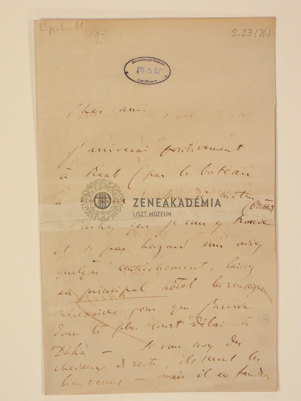 Liszt bejelenti érkezését Győrbe és kéri, hogy ott várja, vagy hagyjon neki utasításokat, hogyan jusson Dákába.