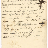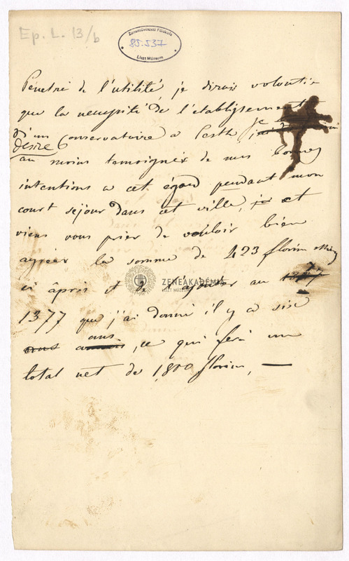 Liszt nyilatkozata francia nyelven, amelyben a létesítendő konzervatórium javára korábban adományozott 1377 forinthoz további 423 forintot ad.