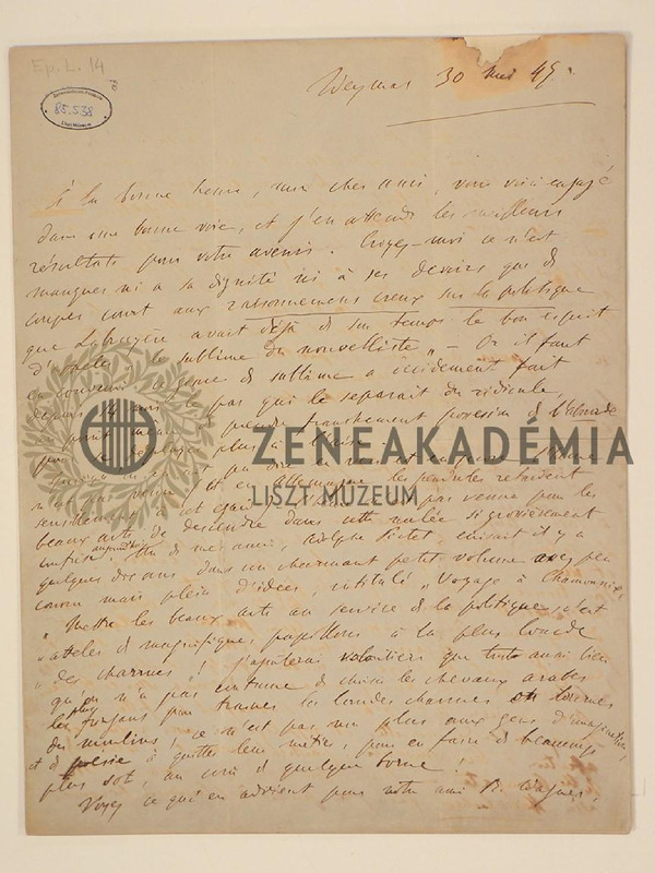 Hosszú levél a politikáról, Wagnerről, Liszt Tannhäuser-cikkéről, Liszt újabb műveiről (zongoraversenyek, tervezett átiratok a Prófétából).