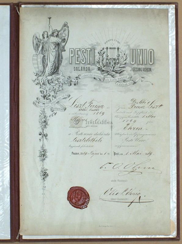 A Pesti Unió Dalárda díszoklevele Liszt tiszteletbeli tagságáról.