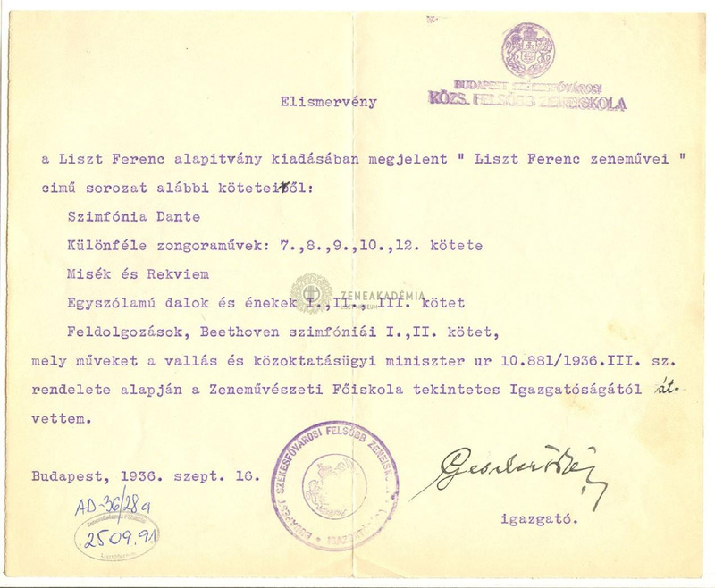 Geszler Ödön, a Budapest Székesfővárosi Községi Felsőbb Zeneiskola igazgatójának elismervénye a Liszt-összkiadás köteteinek átvételéről.