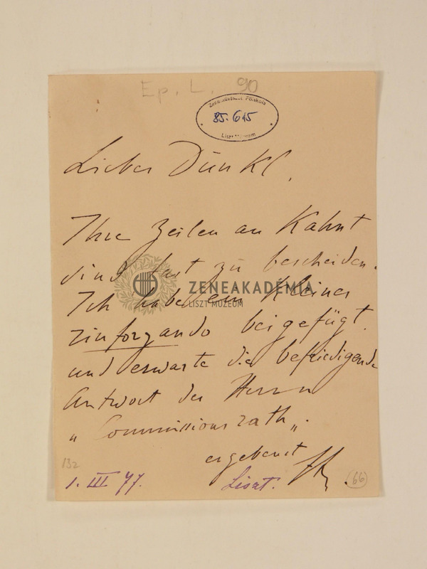 Liszt Ferenc levele Dunkl Nepomuk Jánoshoz.