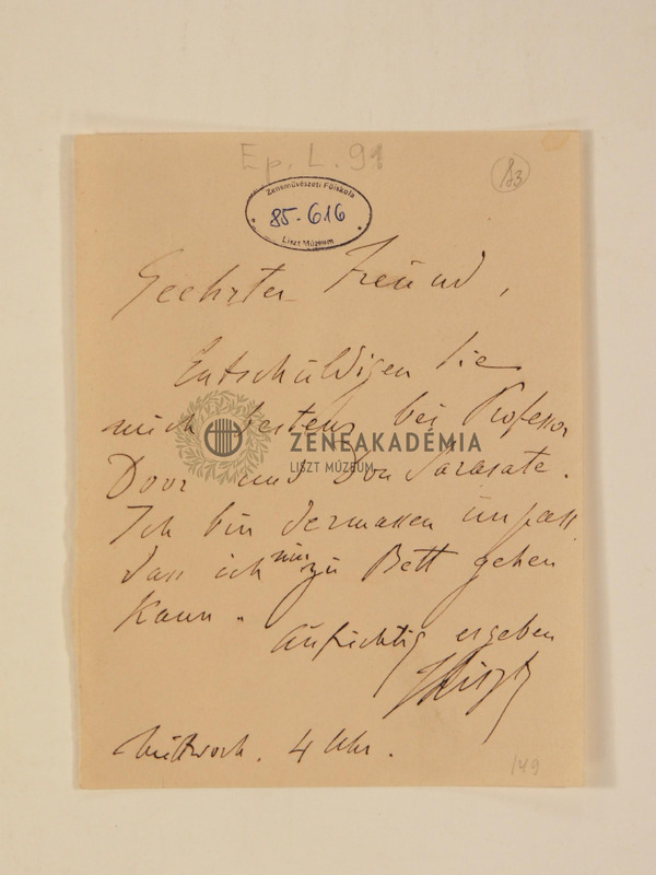 Liszt Ferenc levele Dunkl Nepomuk Jánoshoz.