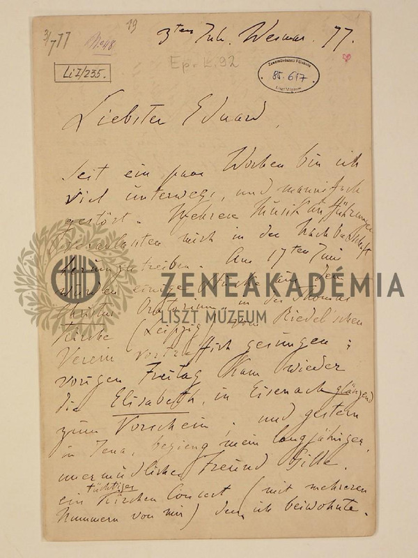 Műveinek (Christus, Szent Erzsébet legendája, egyházi kórusművek) türingiai előadásáról, unokaöccse esküvőjéről, terveiről.