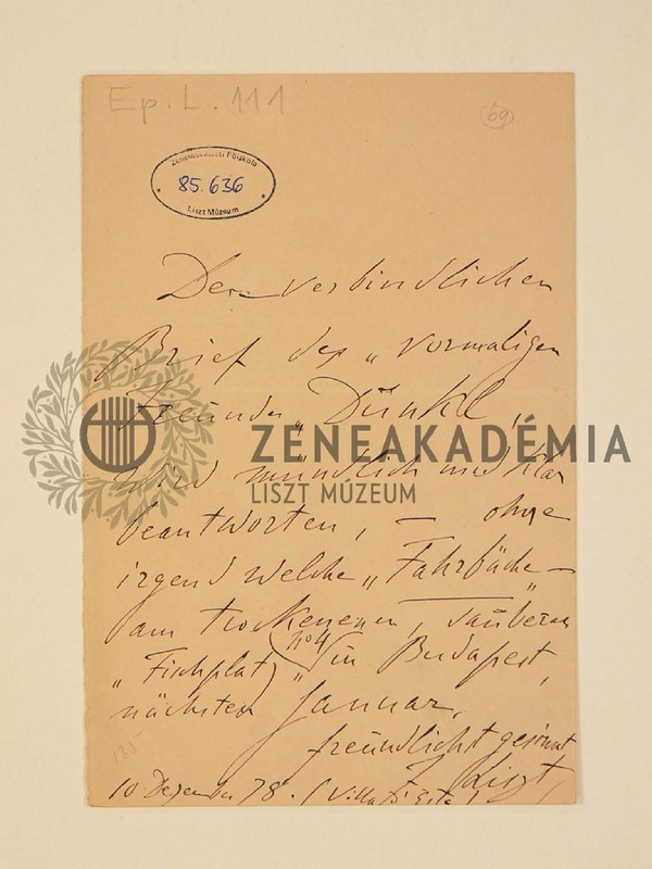 Liszt Ferenc levele Dunkl Nepomuk Jánoshoz.