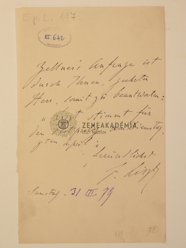 Liszt Ferenc levele Dunkl Nepomuk Jánoshoz.