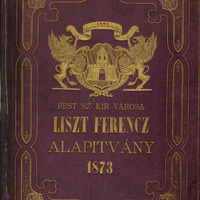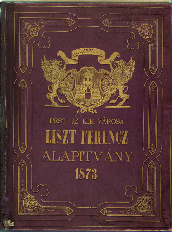 Pest Város Liszt Ferenc Alapítványának díszalbuma (1870) Liszt 50 éves művészi jubileumára, alapítólevéllel, záradékkal(1890) 4 fólióban, s a városi házipénztárból évente fizetendő 200 ft ösztöndíjról.