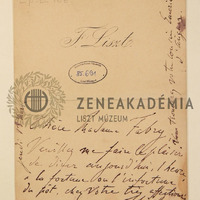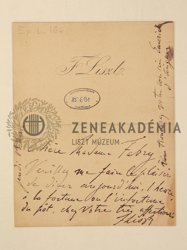 Liszt Ferenc névjegye Fábry Amáliához írt sorokkal.