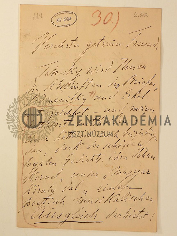 Liszt Ferenc levele Ábrányi Kornélhoz.