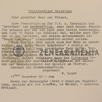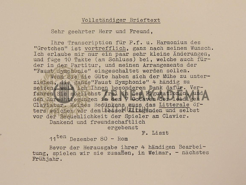 A Faust szimfónia "Gretchen" tételének zongora-harmónium átiratát kiválónak tartja. Kéri, hogy az egész Faust szimfóniát dolgozza át négy kézre.